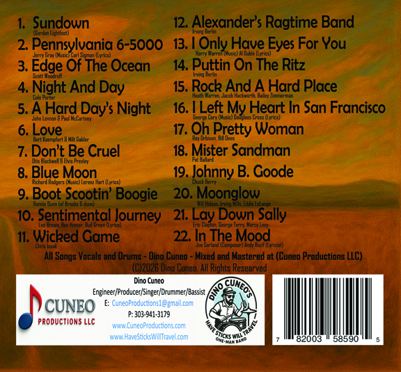 Driven by Cuneo’s signature drumming and expressive vocals, the album honors the spirit of the originals while making them unmistakably his own. Each track feels intentional, carefully chosen to represent a chapter along the way – from early inspirations to hard-earned perspective.